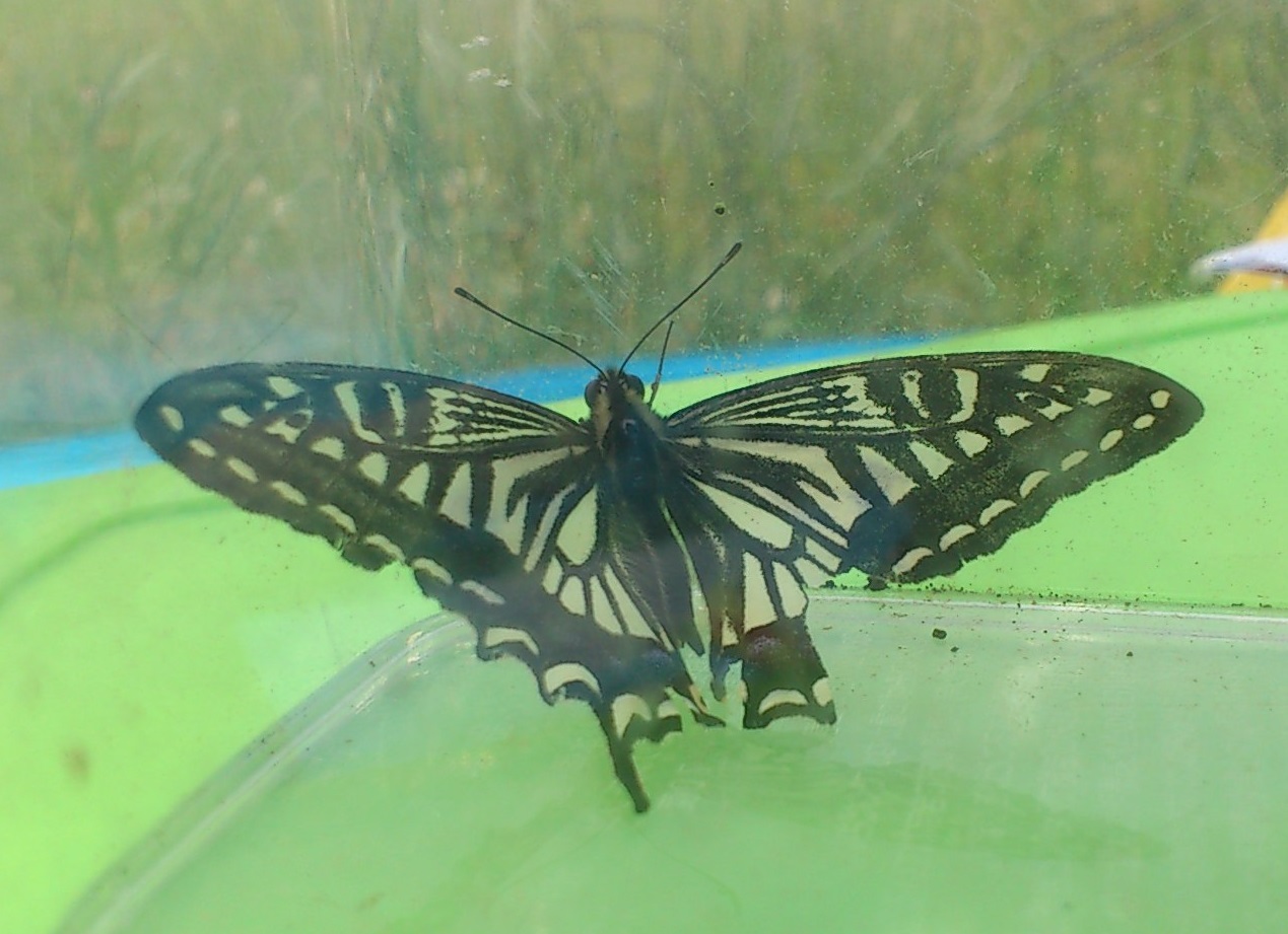 夕方4時ごろ、もうチョウが一匹も見つけられなくて帰ろうとしたとき、大きな木のとても高いところで飛んでいるチョウを見つけました。そして、降りてくるのを待って追いかけてつかまえました。見てみると、ナミアゲハだったのでとてもうれしかったです。