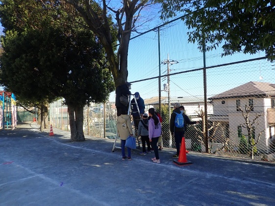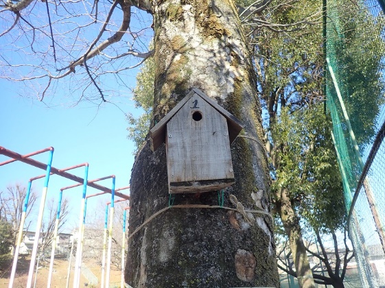 校庭の巣箱の確認と巣箱かけ