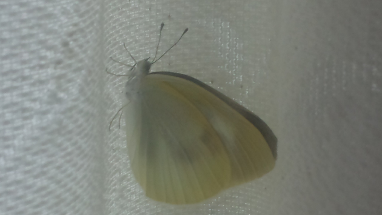 どこに潜伏していたのかとても不思議でびっくりしましたが、無事に蝶となり姿を見せてくれてよかったです。外に出たい様子で、バタバタと羽を動かすのでじっくり観察はできませんでしたが、全体は白っぽくほのかな黄色で、羽を広げると黒い模様が見えました。写真はカーテンに止まっている姿です。