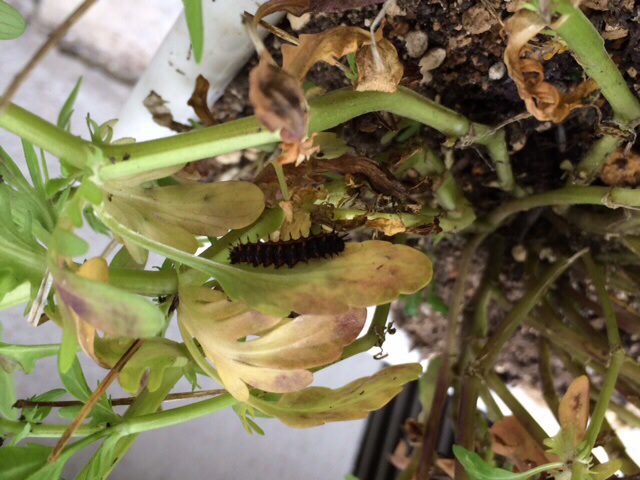 蝶を見かけたときに思ったこと感じたこと: 咲き終わりかけたビオラを抜こうとしたら、ツマグロヒョウモンの幼虫を見付けました。葉が少なくなっているので、足りるのか心配ですが、幼虫の成長を見守りたいと思います。