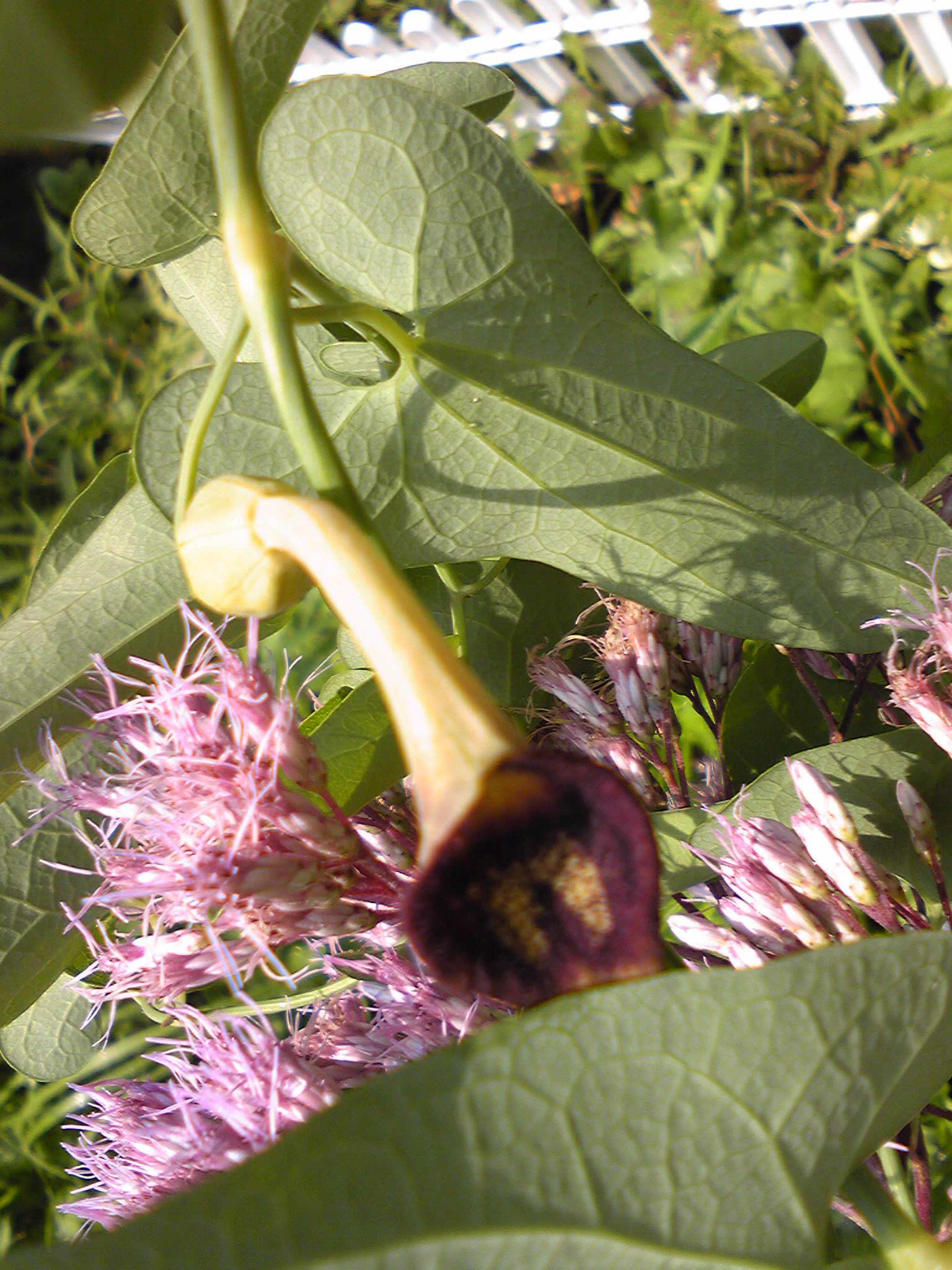 蝶の食草や蜜源に関する情報: 今年の夏は、初めてウマノスズクサの花が咲きました。 花の形が、馬の首に下げる鈴の形に似ていますか? 葉っぱはジャコウアゲハの食草です。学校にもジャコウアゲハが現れるといいなあ。