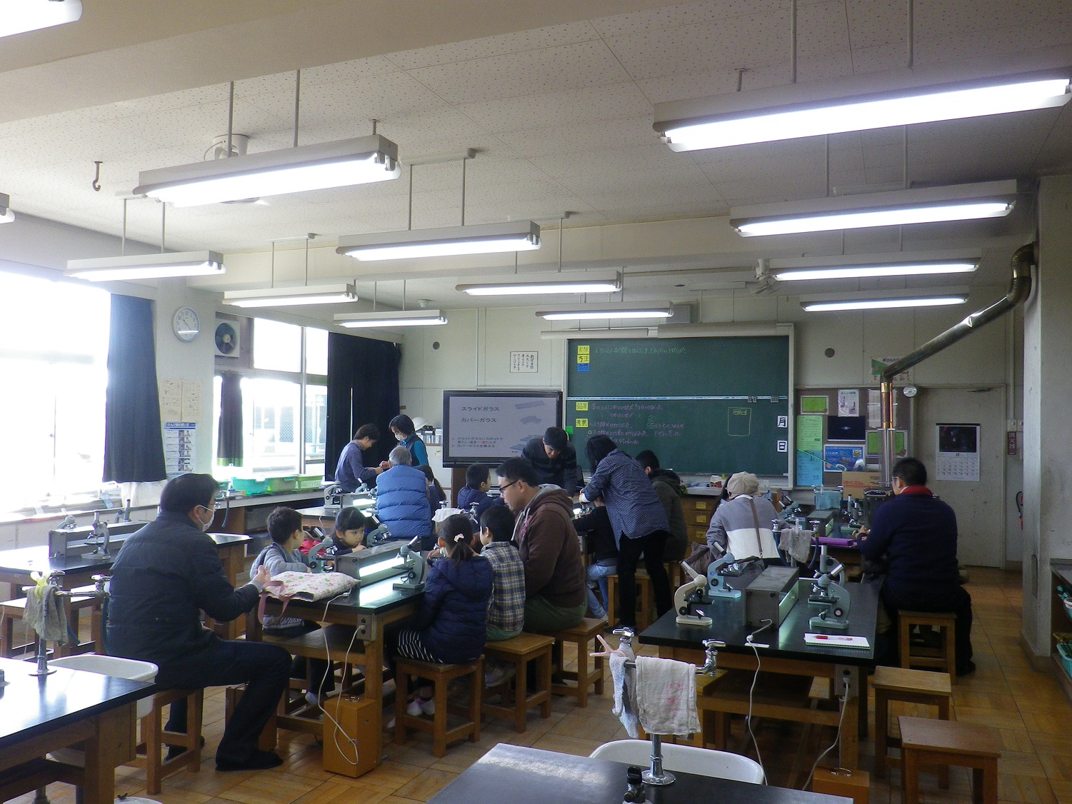 お父さんやお母さん、おじいちゃんに手伝ってもらいながら、子供たちはそれぞれがとってきた水を顕微鏡で見ることが出来ました。