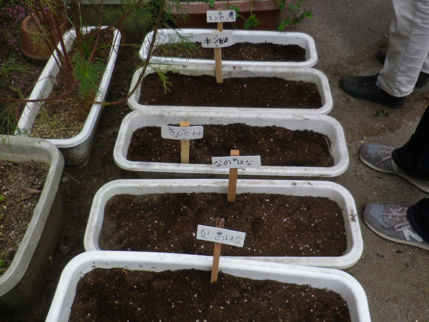その後、中庭のプランターにナノハナ、キンセンカ、カモミールのタネをまきました。