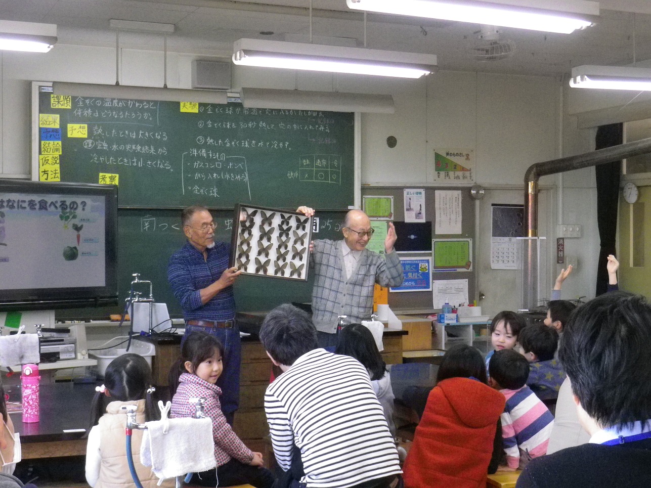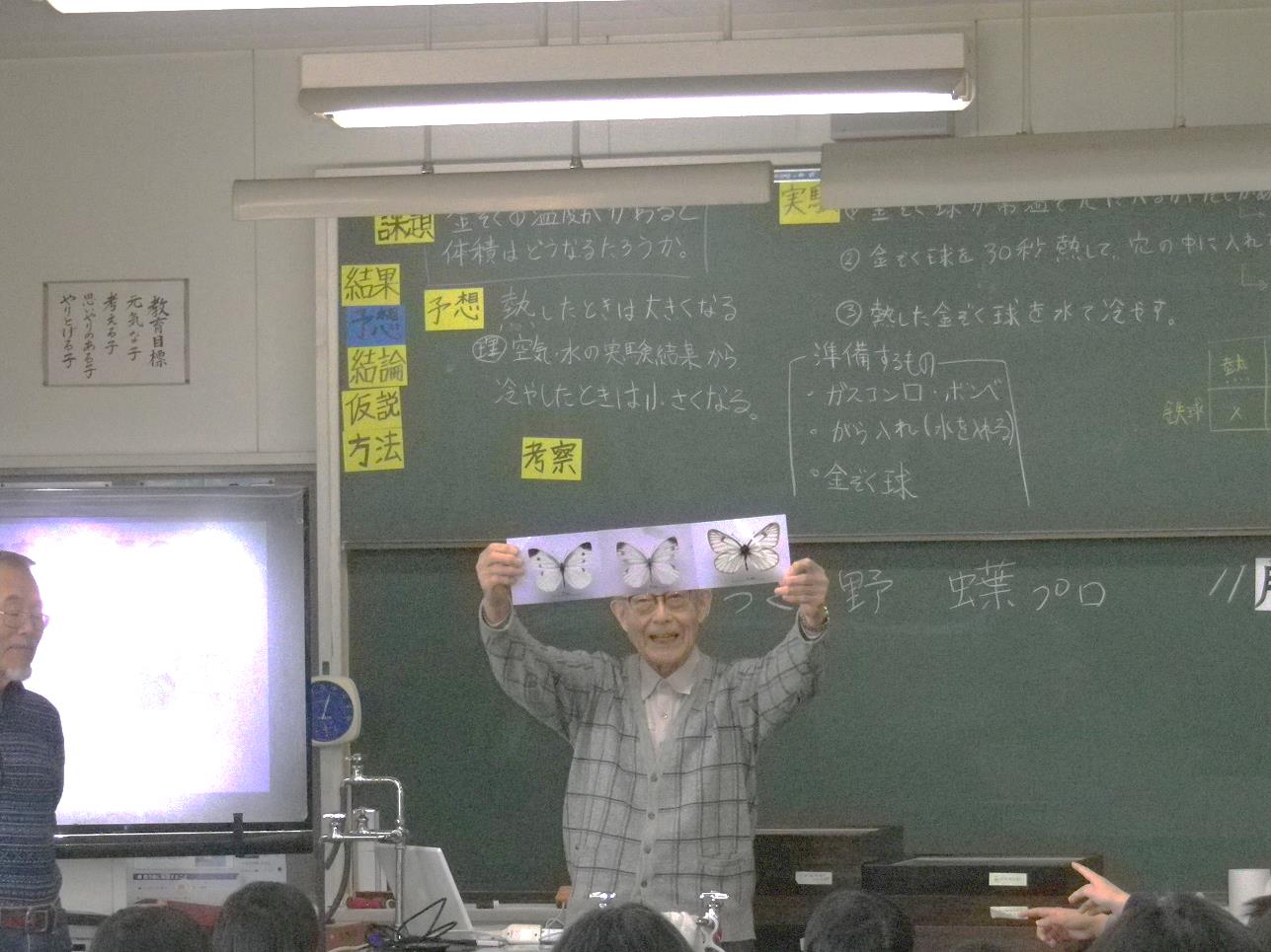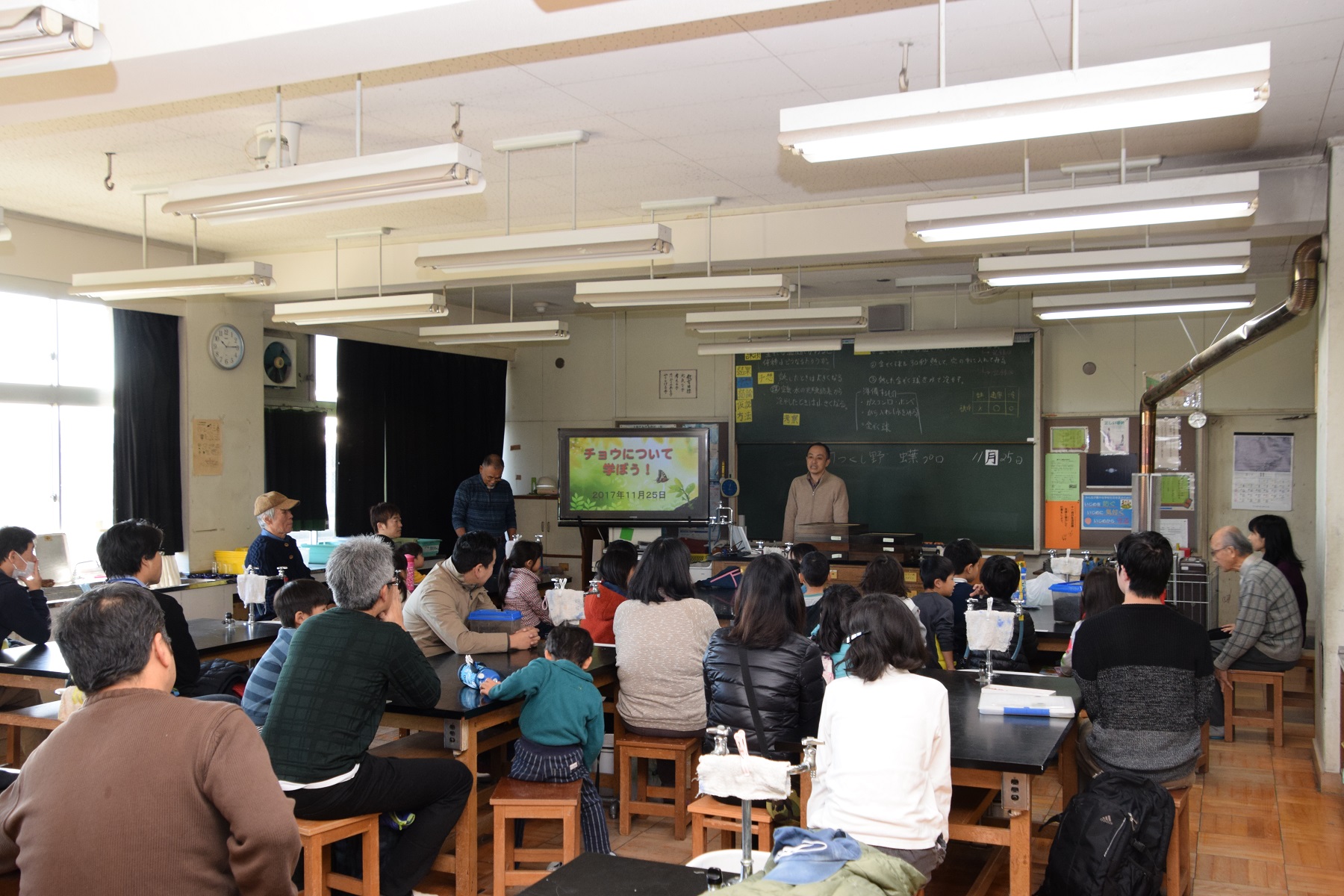 その後、金森在住の清水敏弘さんが、身近な黒いチョウの見分け方、白いチョウの見分け方などを標本を見ながらお話してくださいました。