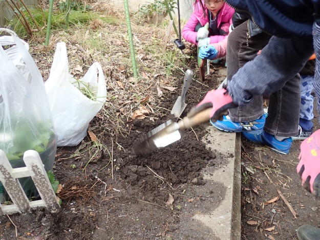 校庭の三角花壇にムスカリの球根とミヤコワスレの苗を植えました。