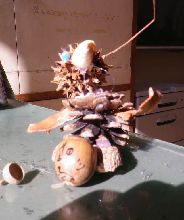 どんぐりの帽子でイモムシ、他の実でハリネズミ、トリなどを作りました。