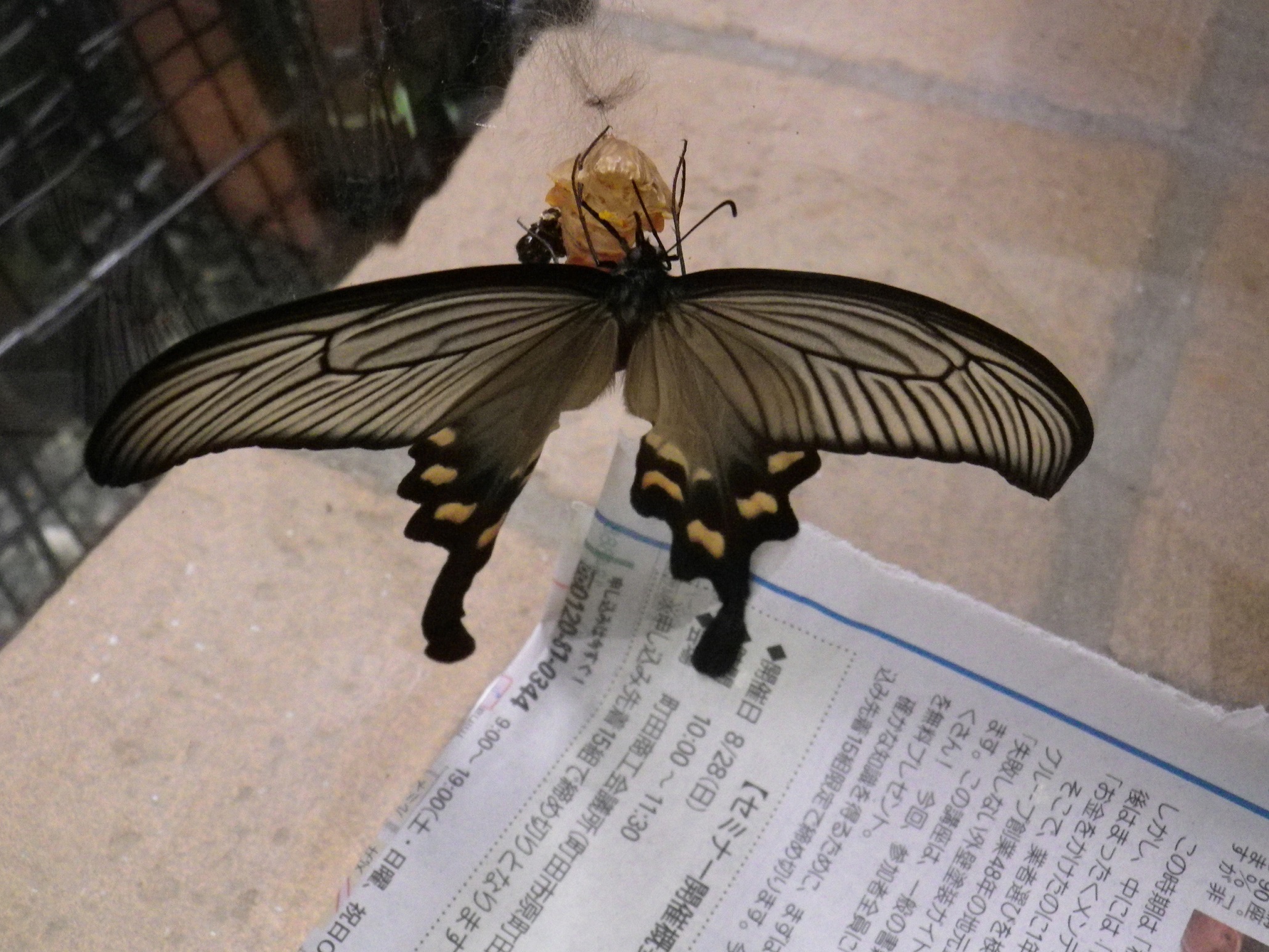 ウマノスズクサを食べつくしたジャコウアゲハの幼虫は、台風が続き行方不明だったのですが、気が付かなかっただけで、離れたところのウマノスズクサを食べ終齢幼虫となっていたようです。黒いツノツノ幼虫が必死に自転車によじ登っているところを発見しました。ここでさなぎになると困るので捕獲、飼育ケースに入れるておいたのですが、10月5日、無事チョウになりました。女の子でした。