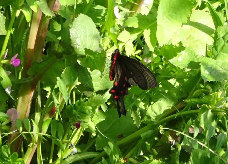 黒い蝶?何の蝶だろう? 知りたくて、しばらく追いかけて、ようやく撮れました。嬉しかったです。ウチに帰りしらべたところ、ジャコウアゲハでした^^