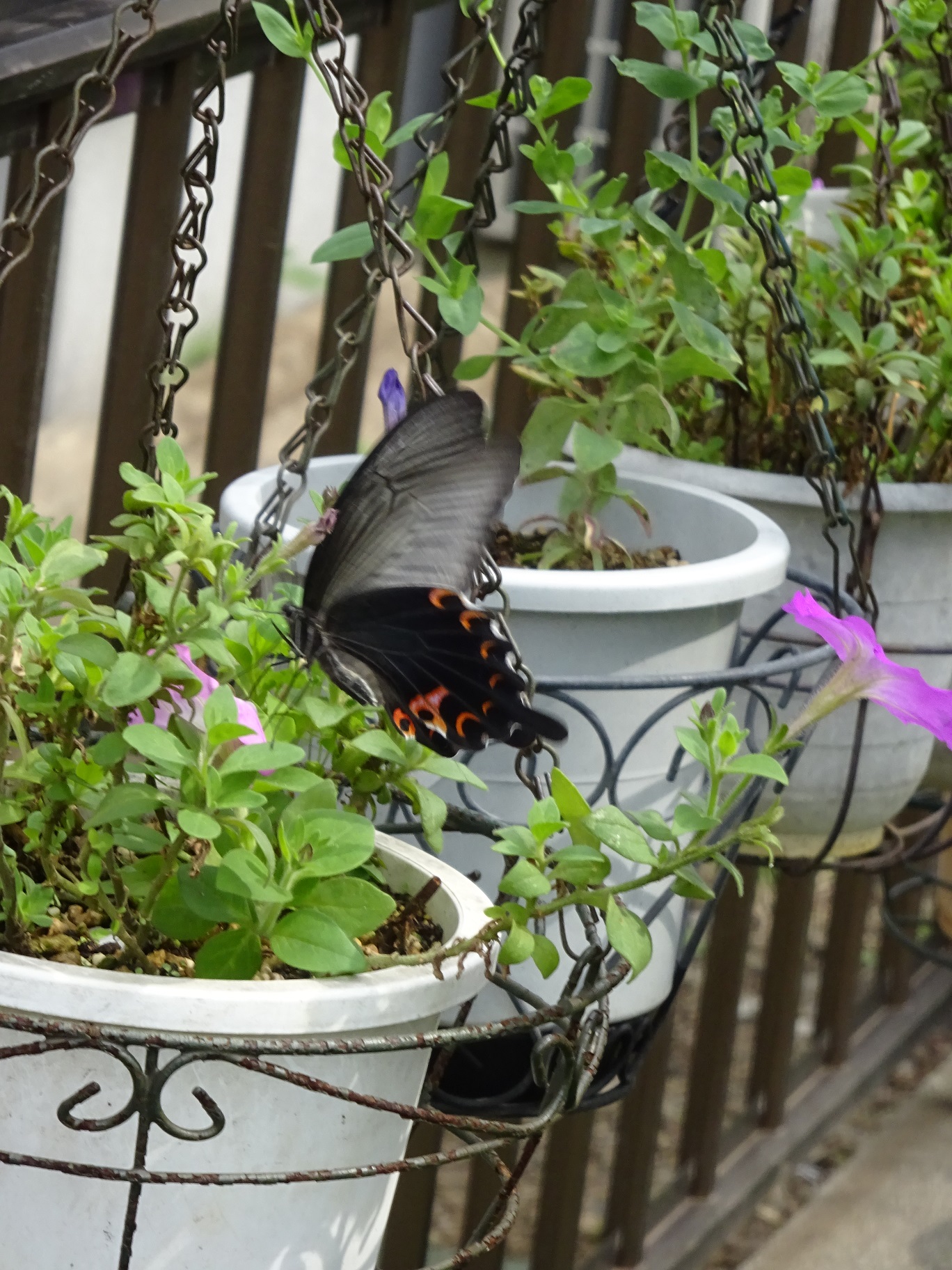 庭のペチュニアの蜜を吸いに来た黒い蝶。クロアゲハでした。
