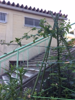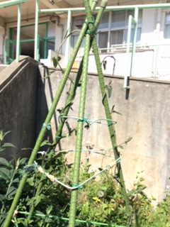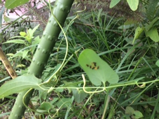 ウマノスズクサのつるが支柱に強烈に巻き上がってきました。